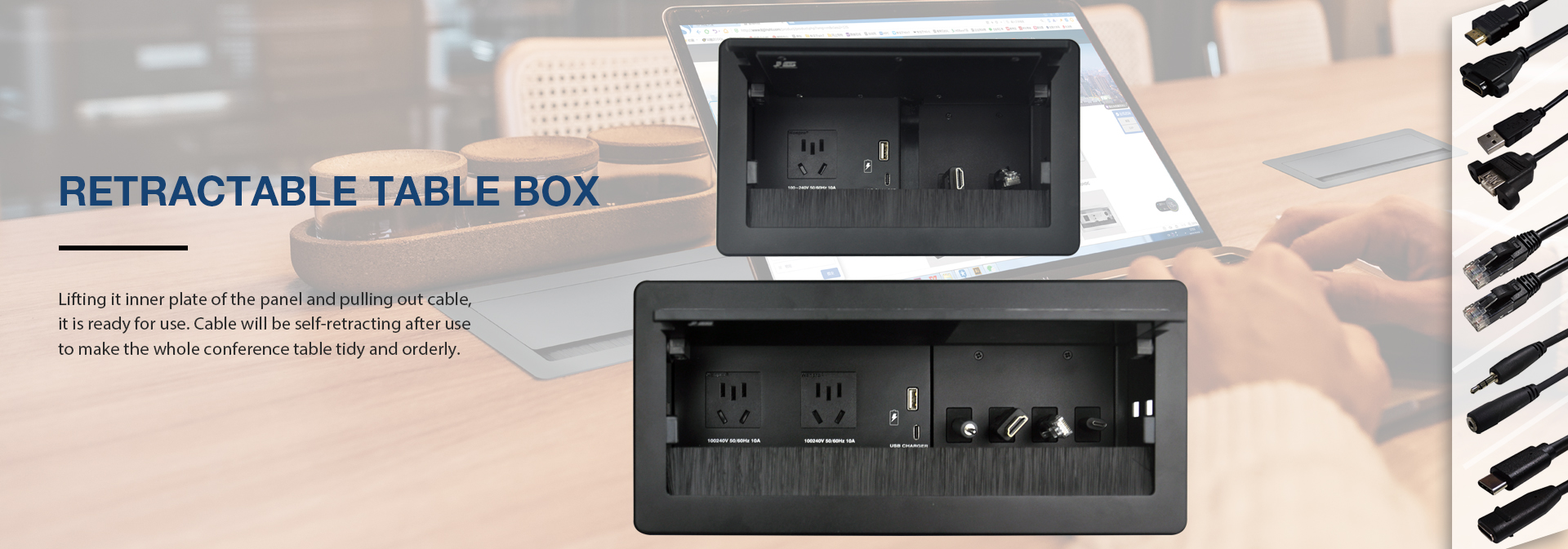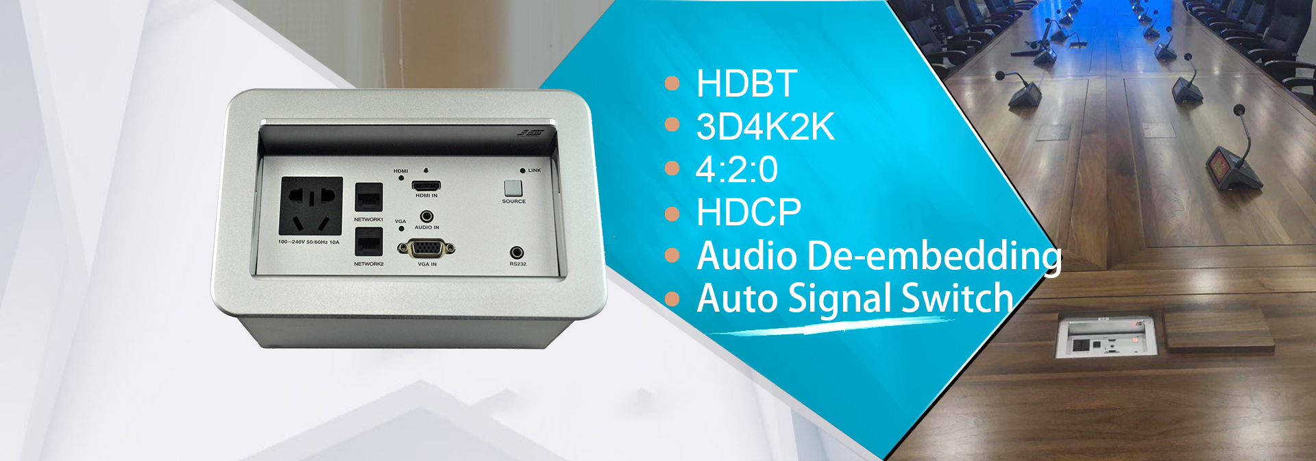 JS series interconnect box is to remove the obstacles by combine all sockets in one plate and special designed conceal structure. It is ? ush- mounted on tabletop with cables connected under table in orderly. Users just need to open the top panel that all ports or cables will appear for use.